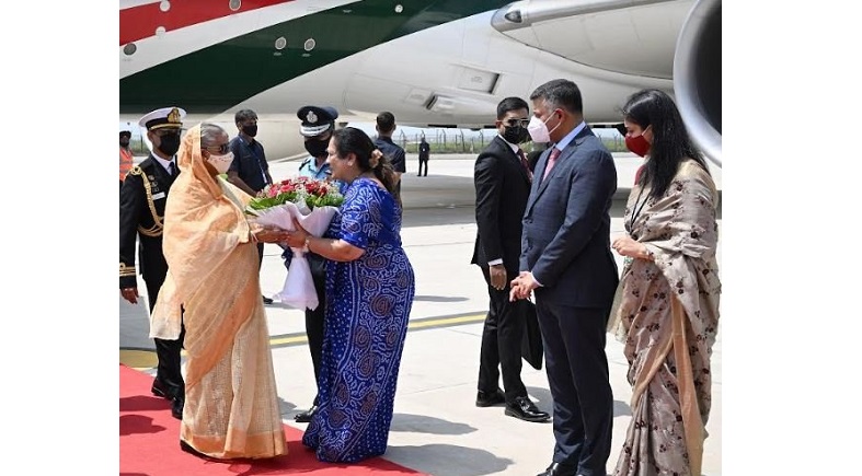 প্রধানমন্ত্রীর প্রেস সচিব ইহসানুল করিম জানান, ‘প্রধানমন্ত্রী ও তাঁর সফরসঙ্গীদের বহনকারী বিমান বাংলাদেশ এয়ারলাইন্সের একটি ভিভিআইপি চার্টার্ড ফ্লাইট আজ স্থানীয় সকাল সময় ১১টা ৪০ মিনিটে নয়াদিল্লির পালাম বিমানবন্দরে অবতরণ করে।’ সেখানে বাংলাদেশের প্রধানমন্ত্রীকে ভারতের রেল ও বস্ত্র প্রতিমন্ত্রী দর্শনা বিক্রম এবং ভারতে বাংলাদেশের হাইকমিশনার মুহাম্মদ ইমরান অভ্যর্থনা জানান। শেখ হাসিনার সম্মানে বিমানবন্দরে লাল গালিচা বিছানোর পাশাপাশি ৬-৭ সদস্যের একটি সাংস্কৃতিক দল স্বাগত নৃত্য ও বাদ্যযন্ত্র পরিবেশন করে।