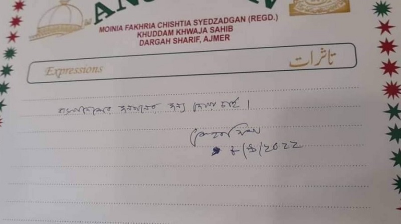 যা লিখলেন প্রধানমন্ত্রী দরগা শরিফের স্মারক বইতে