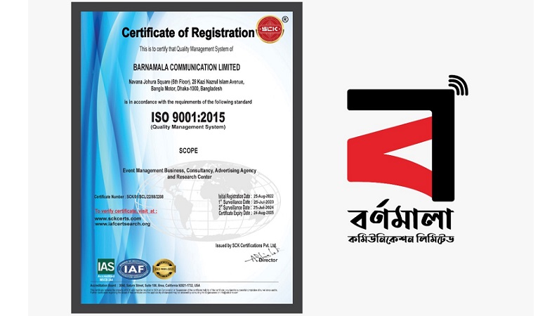 ব্যবসায় পরিচালনার আন্তর্জাতিক মান বজায় রাখার স্বীকৃতি হিসেবে আইএসও (ISO) সনদ পেল দেশের স্বনামধন্য বিজ্ঞাপনী এবং ইভেন্ট ম্যানেজমেন্ট প্রতিষ্ঠান বর্ণমালা কমিউনিকেশন লিমিটেড। গুণগত মানোন্নয়নের ধারাবাহিকতায় প্রতিষ্ঠানটি ইন্টারন্যাশনাল স্ট্যান্ডার্ডাইজেশন অর্গানাইজেশন আইএসও ৯০০১:২০১৫ সনদ অর্জন করলো।