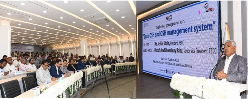 শনিবার সকালে এফবিসিসিআই কার্যালয়ে বেসিক ওএসএইচ অ্যান্ড ওএসএইচ ম্যানেজমেন্ট সিস্টেম শীর্ষক দু’দিন ব্যাপী এ প্রশিক্ষণ কর্মশালায় উদ্বোধন করেন এফবিসিসিআই সভাপতি মো. জসিম উদ্দিন। এসময় তিনি বলেন, দেশের সকল শিল্পে পেশাগত নিরাপত্তা ও স্বাস্থ্য সুরক্ষা নিশ্চিত করতে হবে। স্বল্পোন্নত দেশ থেকে উন্নয়নশীল দেশে রুপান্তরের পথে শিল্পকে নিরাপদ করা অত্যন্ত গুরুত্বপূর্ণ। সভাপতি বলেন, দেশের অনেক খাতই বিশ্বমানের পণ্য তৈরি করে। শোভন কর্মপরিবেশ নিশ্চিত করা গেলে এসব পণ্য রপ্তানির সম্ভাবনা তৈরি হবে।