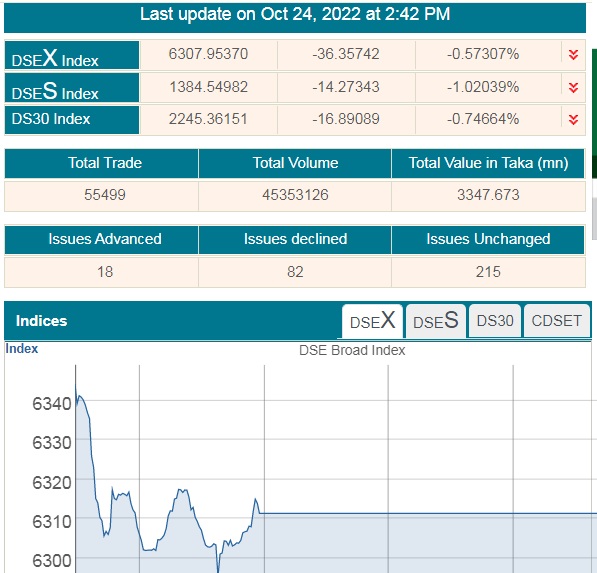 বাজার বিশ্লেষণে দেখা যায়, ডিএসই প্রধান বা ডিএসইএক্স সূচক ৩৬ পয়েন্ট কমে অবস্থান করছে ৬ হাজার ৩০৭ পয়েন্টে। অন্য সূচকগুলোর মধ্যে ডিএসইএস বা শরীয়াহ সূচক ১৪ পয়েন্ট কমে অবস্থান করছে ১ হাজার ৩৮৪ পয়েন্টে।