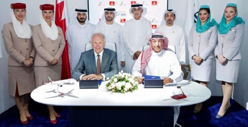 এমিরেটস এয়ার লাইনের প্রেসিডেন্ট টিম ক্লার্ক এবং গালফ্ এয়ারের প্রধান নির্বাহী ক্যাপ্টন ওয়ালিদ আল আলাওয়াই চুক্তিটি স্বাক্ষর করেন।