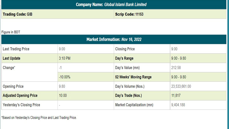প্রাথমিক গণপ্রস্তাবের (আইপিও) মাধ্যমে অভিহিত মূল্যে ৪২ কোটি ৫০ লাখ শেয়ার বিক্রি করে গ্লোবাল ইসলামী ব্যাংক। এর মাধ্যমে বাজার থেকে ৪২৫ কোটি টাকা উত্তোলন করে। আজ বুধবার (১৬ নভেম্বর) মূল মার্কেটে ব্যাংকটির শেয়ার লেনদেন শুরু হয়। কিন্তু প্রথম দিনেই শেয়ারটি ১০ শতাংশ বা ১ টাকা দর হারায়। দিন শেষে এই শেয়ারের মূল্য দাঁড়ায় ৯ টাকা।