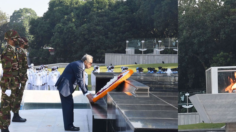 সশস্ত্র বাহিনীর সর্বাধিনায়ক রাষ্ট্রপতি সকালে শিখা অনির্বাণের বেদীতে পুষ্পস্তবক অর্পণ করেন। শিখা অনির্বাণে ফুল দিয়ে শ্রদ্ধা নিবেদনের পর কিছু সময় নীরবে দাঁড়িয়ে থাকেন তিনি। এ সময় তিন বাহিনীর বাহিনীর একটি চৌকস দল সশস্ত্র সালাম জানায়। বিউগলে বাজানো হয় করুণ সুর। পরে রাষ্ট্রপতি সেখানে রক্ষিত পরিদর্শক বইয়ে স্বাক্ষর করেন।