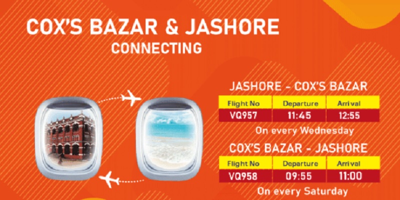 সরাসরি ফ্লাইটটি যশোর থেকে প্রতি সপ্তাহে বুধবার সকাল ১১টা ৪৫ মিনিটে ছেড়ে কক্সবাজারে দুপুর ১২টা ৫৫ মিনিটে পৌছাবে। কক্সবাজার থেকে প্রতি সপ্তাহে শনিবার সকাল ৯টা ৫৫ মিনিটে ছেড়ে যশোরে সকাল ১১টায় পৌছাবে। এই রুটে ওয়ানওয়ে সর্বনিম্ন ভাড়া ৫,৯০০ টাকা নির্ধারন করা হয়েছে।