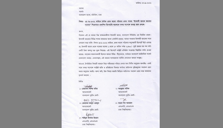 রোববার সুপ্রিম কোর্টের আইনজীবী অ্যাডভোকেট মোহাম্মদ শিশির মনিরসহ ইসলামী ব্যাংকের পাঁচজন গ্রাহক এ চিঠি দেন। অন্যরা হলেন- অ্যাডভোকেট মোহাম্মদ আব্দুল ওয়াদুদ, অ্যাডভোকেট আবদুল্লাহ সাদিক, শাইখুল ইসলাম ইমরান ও যায়েদ বিন আমজাদ।