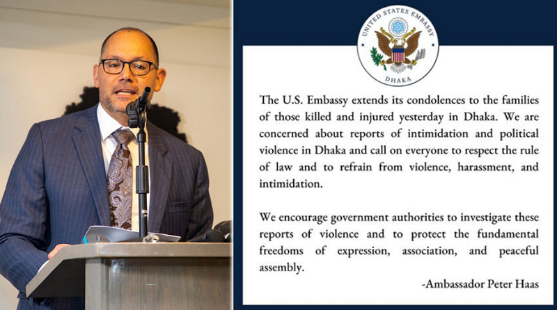 পিটার হাস বলেন, যুক্তরাষ্ট্র দূতাবাস বুধবার ঢাকায় নিহত ও আহতদের পরিবারবর্গের প্রতি সমবেদনা জানাচ্ছে। সহিংসতার এই খবরগুলোর সুষ্ঠু তদন্ত করতে, এবং মত প্রকাশ, সভা ও শান্তিপূর্ণ সমাবেশের মৌলিক স্বাধীনতা রক্ষা করতে আমরা সরকারি কর্তৃপক্ষকে উৎসাহিত করছি।