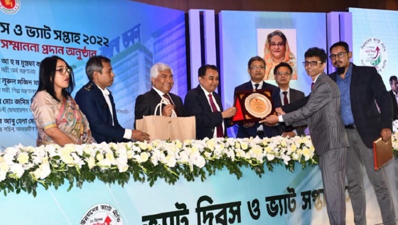 অনুষ্ঠানে অর্থমন্ত্রী’র কাছ থেকে সর্বোচ্চ ভ্যাটদাতার ক্রেস্ট ও সম্মাননা সনদ গ্রহণ করেন ওয়ালটন প্লাজার প্রধান নির্বাহী কর্মকর্তা (সিইও) মোহাম্মদ রায়হান।