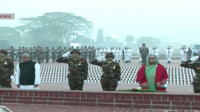 প্রথমে রাষ্ট্রপতি আবদুল হামিদ স্মৃতিসৌধের বেদীতে পুষ্পস্তবক অর্পণ করেন। এরপর প্রধানমন্ত্রী শেখ হাসিনা পুষ্পার্ঘ্য অর্পণ করেন। এসময় রাষ্ট্রপতি ও প্রধানমন্ত্রী মুক্তিযুদ্ধের বীর শহীদদের স্মরণে কিছুক্ষণ নীরবে দাঁড়িয়ে থাকেন। সেনা, নৌ ও বিমান বাহিনীর একটি সুসজ্জিত দল তখন রাষ্ট্রীয় সালাম জানায়। এসময় বিউগলে করুণ সুর বাজানো হয়।