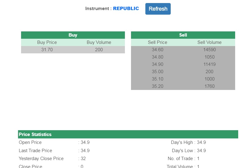 সূত্র মতে, আজ বেলা ১০টা ২৩ মিনিট পরযন্ত রিপাবলিক ইন্স্যুরেন্সের স্ক্রিনে একটি মাত্র ক্রয় আদেশ আছে।যেখানে মাত্র ২০০টি শেয়ার কেনার আদেশ রয়েছে।