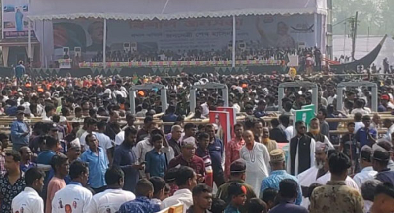 সকাল থেকেই গোপালগঞ্জসহ আশপাশের জেলা থেকে মিছিল-স্লোগানে সমাবেশস্থলে আসতে থাকেন নেতাকর্মীরা। সব শ্রেণি, সব বয়সী মানুষের অংশগ্রহণে জনসমুদ্রে পরিণত হয়েছে মাঠ।