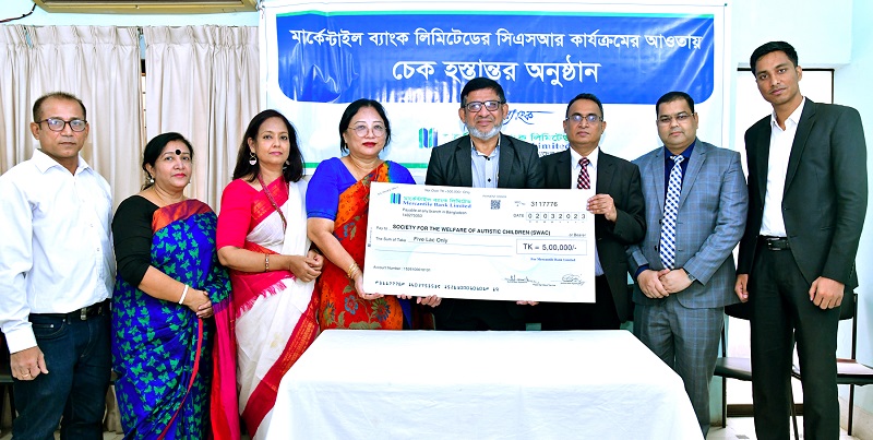 মার্কেন্টাইল ব্যাংক লিমিটেড সোসাইটি ফর দ্য ওয়েলফেয়ার অব অটিস্টিক চিলড্রেন (সোয়াক)-কে ৫ লাখ টাকা অনুদান দিয়েছে।