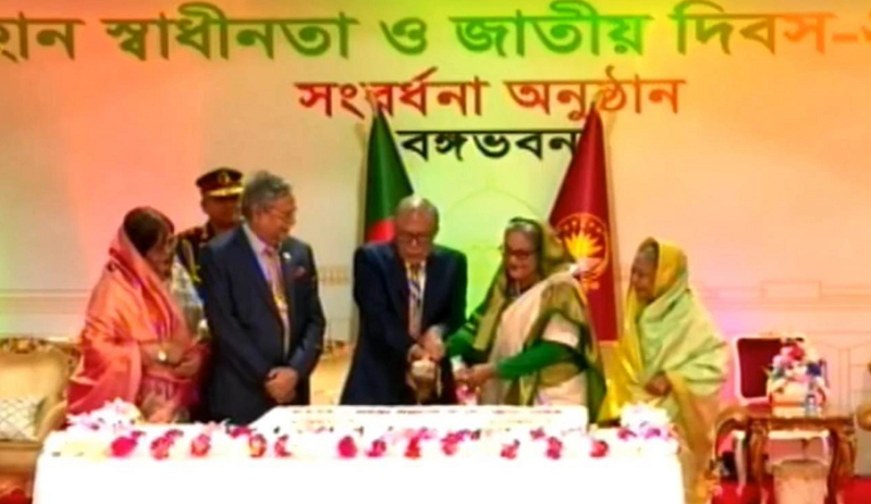 রোববার (২৬ মার্চ) বিকেলে বঙ্গভবনে মহান স্বাধীনতা ও জাতীয় দিবস উদযাপন উপলক্ষ্যে রাষ্ট্রীয় সংবর্ধনা অনুষ্ঠানে এ কেক কাটা হয়।