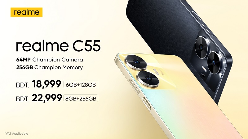 রিয়েলমির এই ফোনের ৬ জিবি র্যাম/১২৮ জিবি রম ভ্যারিয়েন্টটি পাওয়া যাচ্ছে মাত্র ১৮,৯৯৯ টাকায়, এবং ৮ জিবি র্যাম/২৫৬ জিবি রম ভ্যারিয়েন্টটি পাওয়া যাচ্ছে মাত্র ২২,৯৯৯ টাকায় (ভ্যাট প্রযোজ্য)। ব্যবহারকারীদের জন্য স্মুথ ও চ্যাম্পিয়নের মতো অভিজ্ঞতা নিশ্চিত করতে ফোনটির ক্যামেরা, স্টোরেজ, চার্জ ও ডিজাইনে চারটি ক্ষেত্রে নিয়ে আসা হয়েছে সেগমেন্ট-সেরা আপগ্রেড। রিয়েলমি সি৫৫ ডিভাইসে রয়েছে প্রাকৃতিক উপাদান থেকে অনুপ্রাণিত সানশাওয়ার ডিজাইন। ফোনটি পাওয়া যাবে সানশাওয়ার ও রেইনি নাইট, এ দু’টি রঙে। মাত্র ৭.৮৯ মিলিমিটারের এই ফোনটি এই সেগমেন্টের সবচেয়ে দৃষ্টিনন্দন ও পাতলা ডিভাইস, যা হাতে নেয়ার পর আরামদায়ক অনুভূতি পাবেন ব্যবহারকারী। ৯০ হার্জ রিফ্রেশ রেট ও হেলিও জি৮৮ চিপসেট-সহ ৬.৭২ ইঞ্চির এফএইচডি+ রেজ্যুলেশনের স্ক্রিনের এই ফোনটি দুর্দান্ত ভিজ্যুয়াল অভিজ্ঞতা নিশ্চিত করবে।