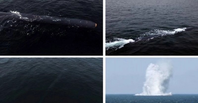 কেসিএনএ’র প্রকাশিত ছবিতে বড়, গাঢ় রংয়ের টর্পেডো আকৃতির একটি বস্তুর পাশাপাশি পানির নিচে বস্তুটির গতিপথ ও সমুদ্রপৃষ্ঠে বিশাল বিস্ফোরণের দৃশ্য দেখা যায়।