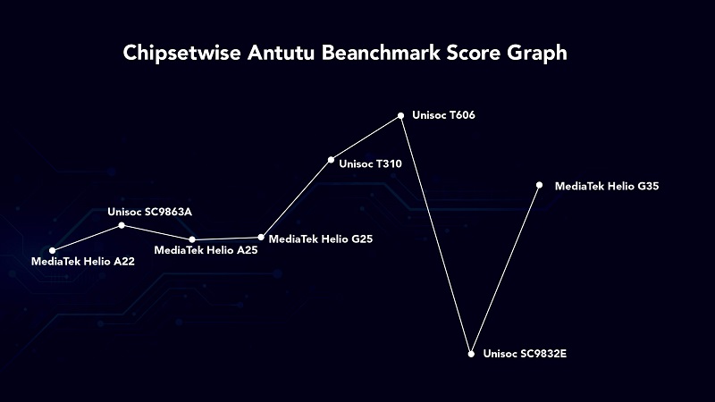 অন্যদিকে একই ক্যাটাগরির ফোনে ব্যবহৃত অন্যান্য চিপসেট যেমন ইউনিসক টি৩১০ এর স্কোর ১৩৬৬৭২, মিডিয়াটেক হেলিও জি৩৫ এর স্কোর ১২২৬৬৬, ইউনিসক এসসি৯৮৬৩এ এর স্কোর ১০০৩৮৩, মিডিয়াটেক হেলিও জি২৫ এর স্কোর ৯৩৬৮৯, হেলিও এ২৫ এর স্কোর ৯২০৬৫ এবং হেলিও এ২২ এর স্কোর ৮৬০৫৫।