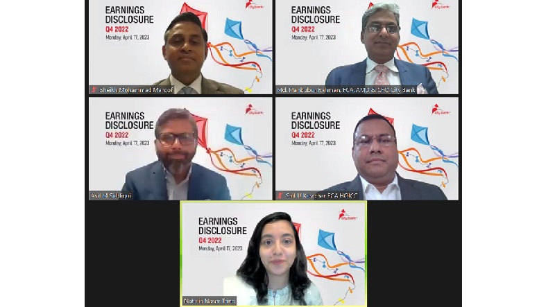 সিটি ব্যাংক তাদের ২০২২ সালের চতুর্থ প্রান্তিকের আর্থিক প্রতিবেদন প্রকাশ করেছে। এ উপলক্ষে সোমবার (১৭ এপ্রিল) অনলাইনের মাধ্যমে বিনিয়োগকারী, শেয়ার বিশ্লেষক এবং গণমাধ্যমের কাছে ব্যাংকের আর্থিক প্রতিবেদন সম্পর্কে বিস্তারিত তথ্য জানানো হয়। অনুষ্ঠানটি বিশ্বজুড়ে ওয়েবের মাধ্যমে ইন্টারনেটে সরাসরি সম্প্রচার করা হয়।