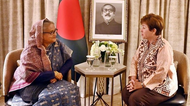 বাংলাদেশের প্রধানমন্ত্রী তাঁর দেশের সার্বিক উন্নয়ন নিশ্চিত করতে সরকারের নানা উদ্যোগ সম্পর্কে আইএমএফ প্রধানকে অবহিত করেন। তিনি বলেন, দেশের উন্নয়ন একদিনে হয়নি বরং এটি দীর্ঘদিনের পরিকল্পনার ফল। পট পরিবর্তনের পর কারাগারে থাকা অবস্থায় তিনি যেভাবে বাংলাদেশের উন্নয়ন চেয়েছেন সেভাবে তাঁর পরিকল্পনা করেন এবং ২০০৯ সালে দ্বিতীয় মেয়াদে ক্ষমতায় আসার পর সেই পরিকল্পনা অনুযায়ী কাজ শুরু করেন। তিনি জলবায়ু পরিবর্তনের বিরূপ প্রভাব মোকাবেলা এবং নারীর ক্ষমতায়নে বাংলাদেশের পদক্ষেপ সম্পর্কে আইএমএফ প্রধানকে অবহিত করেন। প্রধানমন্ত্রী বাংলাদেশের উন্নয়ন যাত্রায় আইএমএফের ভূমিকার প্রশংসা করেন এবং ভবিষ্যতেও সমর্থন অব্যাহত রাখবে বলে আশা করেন।