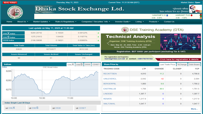 জানা গেছে, বেলা ১১ টা ২৫ মিনিটে ডিএসই ব্রড ইনডেক্স আগের দিনের চেয়ে ২ পয়েন্ট বেড়ে অবস্থান করছে ৬ হাজার ২৮১ পয়েন্টে। আর ডিএসই শরিয়াহ সূচক ১ পয়েন্ট বেড়ে অবস্থান করছে ১ হাজার ৩৭৫ দশমিক ৮ পয়েন্টে এবং ডিএসই–৩০ সূচক ০ দশমিক ৫ পয়েন্ট কমে অবস্থান করছে ২ হাজার ১৯৭ পয়েন্টে।