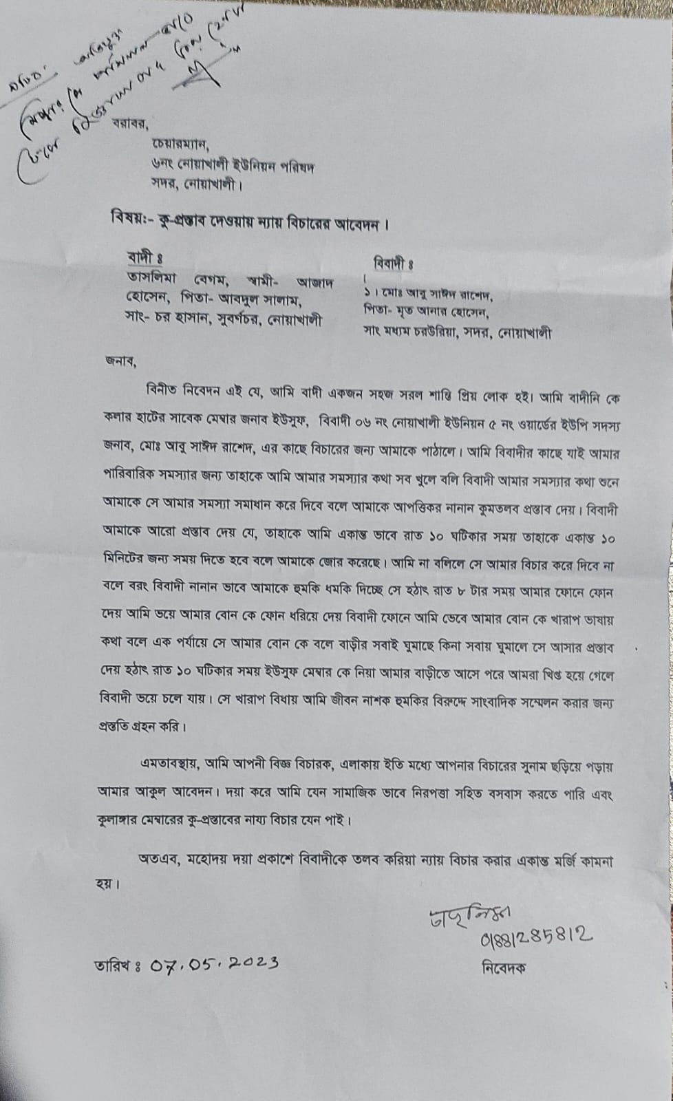লিখিত অভিযোগ ও ভুক্তভোগী সূত্রে জানা গেছে, উপজেলার কলারহাটের সাবেক মেম্বার ইউসুফ ভিকটিমকে নোয়াখালী ইউনিয়নের ৫নম্বর ওয়ার্ডের ইউপি সদস্য রাসেদের কাছে বিচারের জন্য পাঠায়। ভুক্তভোগী নারী তার পারিবারিক সমস্যার কথা মেম্বারকে খুলে বলে। সব কথা শুনে মেম্বার রাসেদ সমস্যা সমাধান করে দিবে বলে ওই নারীকে কুপ্রস্তাব দেয়। একপর্যায়ে রাত ১০টার পরে ওই নারীর কাছে তাকে ১০মিনিট সময় দেওয়ার জন্য জোরাজুরি করে। প্রস্তাবে রাজি না হওয়ায় বিচার করে দিবেনা বলে উল্টো মেম্বার হুমকি ধমকি দেয়। এরপর ভিকটিমের মুঠোফোনে কল দেয়। ভয়ে ভিকটিম ফোন তার বোনকে ধরিয়ে দেয়। ফোনে মেম্বার ভুক্তভোগী নারীকে মনে করে তার বোনকে খারাপ ভাষায় কথা বলে। এরপর ইউসুফ মেম্বারকে নিয়ে রাত ১০টার সময় ভিকেটেমর বাড়ি চলে যায়। তখন ভুক্তভোগী ক্ষিপ্ত হয়ে উঠলে মেম্বার রাসেদ চলে যায়।