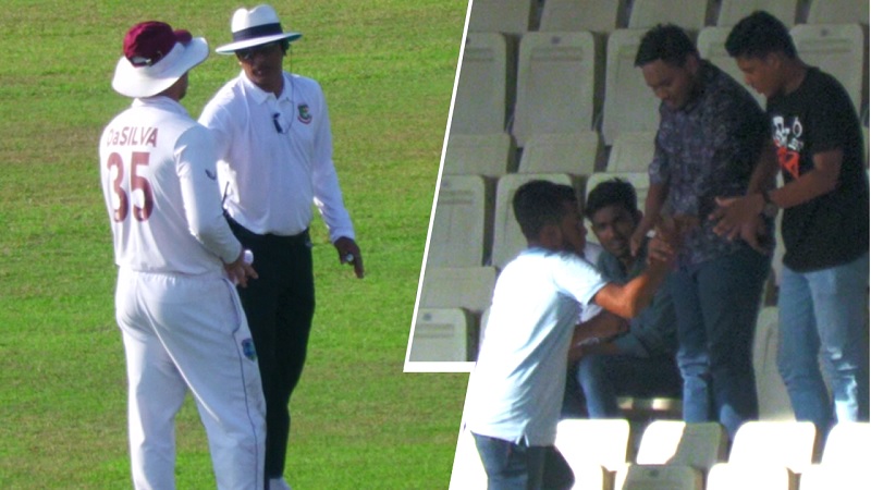 সেই শব্দগুলো কানে গেছে ওয়েস্ট ইন্ডিজ ‘এ’ দলের অধিনায়ক জশুয়া ডি সিলভারও। সঙ্গে সঙ্গেই তিনি আম্পায়ার মাসুদুর রহমান মুকুলের কাছে যান এবং এই ব্যাপারে অভিযোগ করেন। এরপর মুকুল ডেকে পাঠান রিজার্ভ আম্পায়ার নিয়ামুর রশিদকে।
