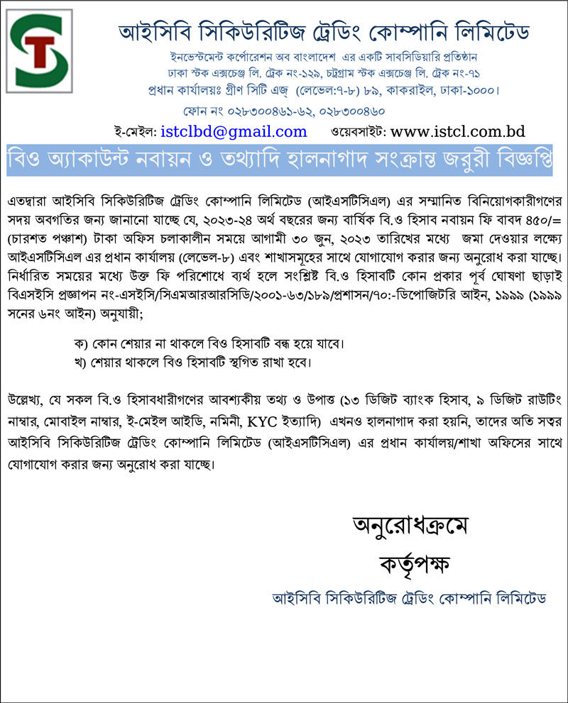 আইসিবি সিকিউরিটিজ ট্রেডিং কোম্পানি লিমিটেড এর বিও একাউন্ট নবায়ন সংক্রান্ত জরুরী বিজ্ঞপ্তি প্রকাশ 2023-06-01 18:13:08 আইসিবি সিকিউরিটিজ ট্রেডিং কোম্পানি লিমিটেড এর বিও একাউন্ট নবায়ন সংক্রান্ত জরুরী বিজ্ঞপ্তি Tweet