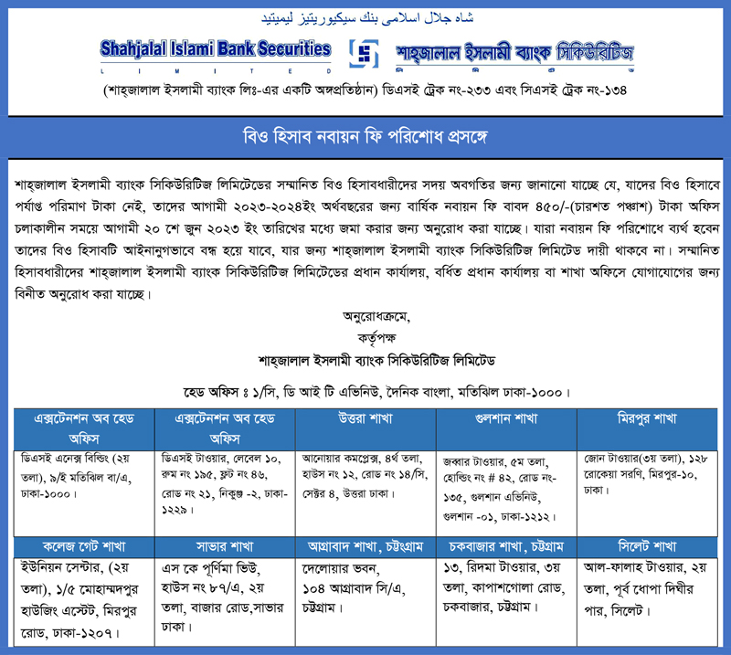 শাহজালাল ইসলামী ব্যাংক সিকিউরিটিজ লিমিটেড এর বিও হিসাব নবায়ন সংক্রান্ত বিজ্ঞপ্তি প্রকাশ 2023-06-10 17:27:06 শাহজালাল ইসলামী ব্যাংক সিকিউরিটিজ লিমিটেড এর বিও হিসাব নবায়ন সংক্রান্ত বিজ্ঞপ্তি Tweet