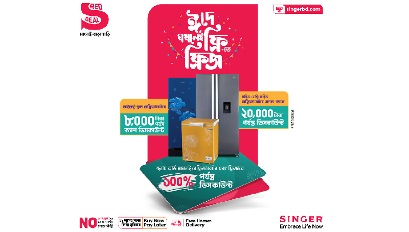 গ্রাহকদের ঈদ-উল-আযহা উৎসবকে আরও উৎসবমুখর করার জন্য, শীর্ষস্থানীয় ইলেকট্রনিক্স ও হোম অ্যাপ্লায়েন্স কোম্পানী সিঙ্গার বাংলাদেশ “ঈদে ঘষলেই ফ্রি তে ফ্রিজ” ক্যাম্পেইনের আওতায় রেফ্রিজারেটর ও ফ্রিজার কিনলেই স্ক্র্যাচ কার্ডে সর্বোচ্চ ১০০% ডিসকাউন্ট প্রদান করছে। ক্যাম্পেইন চলাকালীন দেশব্যাপী যেকোন সিঙ্গার আউটলেট থেকে রেফ্রিজারেটর বা ফ্রিজার কিনলে স্ক্র্যাচ কার্ডের এই ডিসকাউন্ট পাওয়ার সুযোগ রয়েছে।