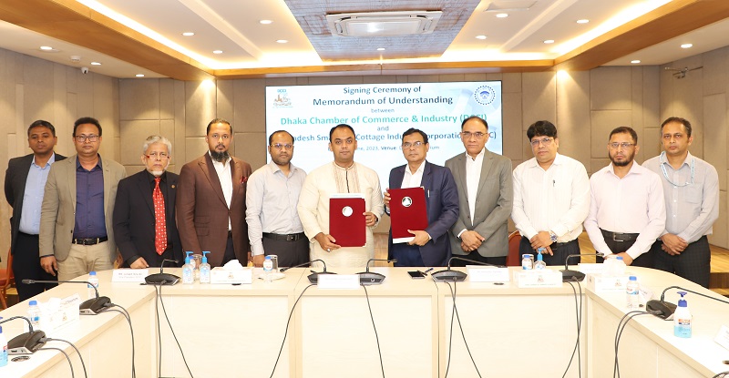 ঢাকা চেম্বার অব কমার্স অ্যান্ড ইন্ডাস্ট্রি (ডিসিসিআই) ও বাংলাদেশ ক্ষুদ্র ও কুটির শিল্প করপোরেশন’র (বিসিক) মধ্যে চুক্তি স্বাক্ষর হয়েছে। সোমবার (২৬ জুন) ঢাকা চেম্বার অডিটোরিয়ামে এই চুক্তি স্বাক্ষরিত হয়।