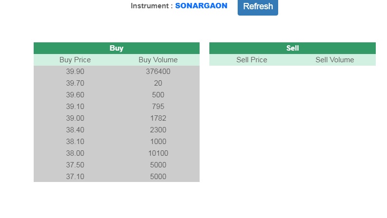 সূত্র মতে, আজ বেলা ১০টা ২১ মিনিট পরযন্ত সোনারগাঁও টেক্সটাইলের স্ক্রিনে ৩ লাখ ৭৬ হাজার টি শেয়ার কেনার আবেদন থাকলেও বিক্রেতার ঘর শূন্য ছিল। আলোচ্য সময়ে কোম্পানিটির শেয়ার সর্বশেষ ৩৯ টাকা ৯০ পয়সা দরে লেনদেন হয়।