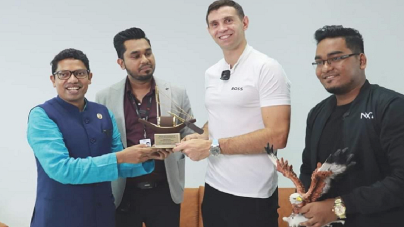 আর্জেন্টিনার বিশ্বকাপজয়ী গোলরক্ষক এমিলিয়ানো মার্তিনেজ মাত্র ১১ ঘণ্টার সফরে ঢাকায় এসেছেন। সোমবার ভোরে তাকে বহনকারী ফ্লাইটটি হযরত শাহজালাল আন্তর্জাতিক বিমানবন্দরে অবতরণ করে। এরপর সেখান থেকে সরাসরি হোটলে গিয়ে বিশ্রাম নেন আর্জেন্টাইন এই তারকা। সোমবারই ঢাকা থেকে কলকাতায় যাবেন তিনি।