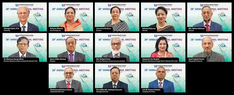 সাউথইস্ট ব্যাংক লিমিটেডের ২৮তম বার্ষিক সাধারণ সভা অনুষ্ঠিত হয়েছে। বুধবার (০৫ জুলাই) সকাল ১১টায় ডিজিটাল প্ল্যাটফর্মের মাধ্যমে সভাটি অনুষ্ঠিত হয়।