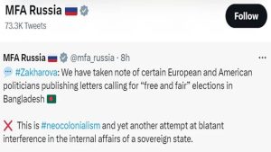 বাংলাদেশে অবাধ ও সুষ্ঠু নির্বাচন নিয়ে যুক্তরাষ্ট্র ও ইউরোপের রাজনীতিকদের চিঠিকে নব্য ঔপনিবেশবাদ হিসেবে দেখছে রাশিয়া। একই সঙ্গে তারা মনে করছে, বিষয়টি বাংলাদেশের অভ্যন্তরীণ বিষয়ে আরও একটি নগ্ন হস্তক্ষেপ।