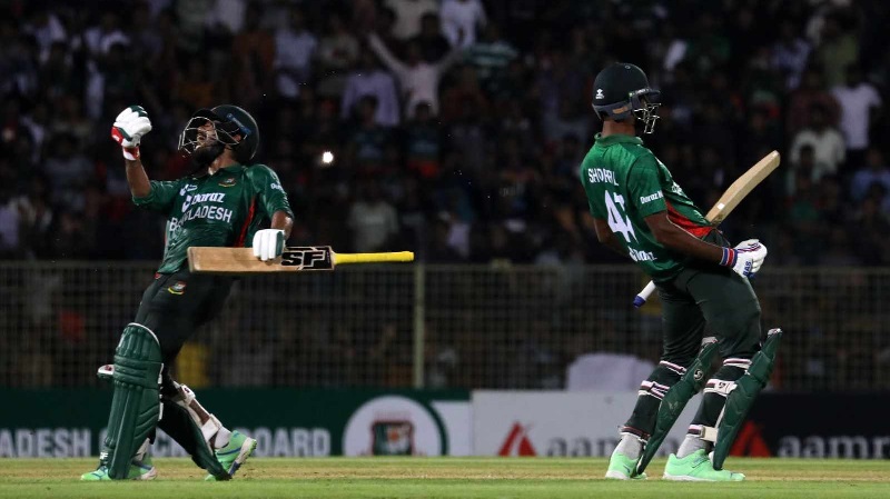 শরিফুল বল ব্যাটে লাগালেনই। সেটা চারও হলো জয়ের বন্দরে পৌঁছে গেল বাংলাদেশ। হৃদয় ৩টি চার ও ২টি ছয়ে ৩২ বলে ৪৭ রান করেন। এমন পারফরম্যান্সের ফলে ম্যাচসেরার পুরস্কারও পেয়েছেন তিনি। মূলত শামীম পাটোয়ারিকে নিয়ে তার চতুর্থ উইকেটে গড়া ৪৩ বলে ৭৩ রানের জুটিই বাংলাদেশকে ম্যাচে রেখেছিল। শামীমের ব্যাট থেকে এসেছে ২৫ বলে ৩৩ রানের দায়িত্বশীল ইনিংস।