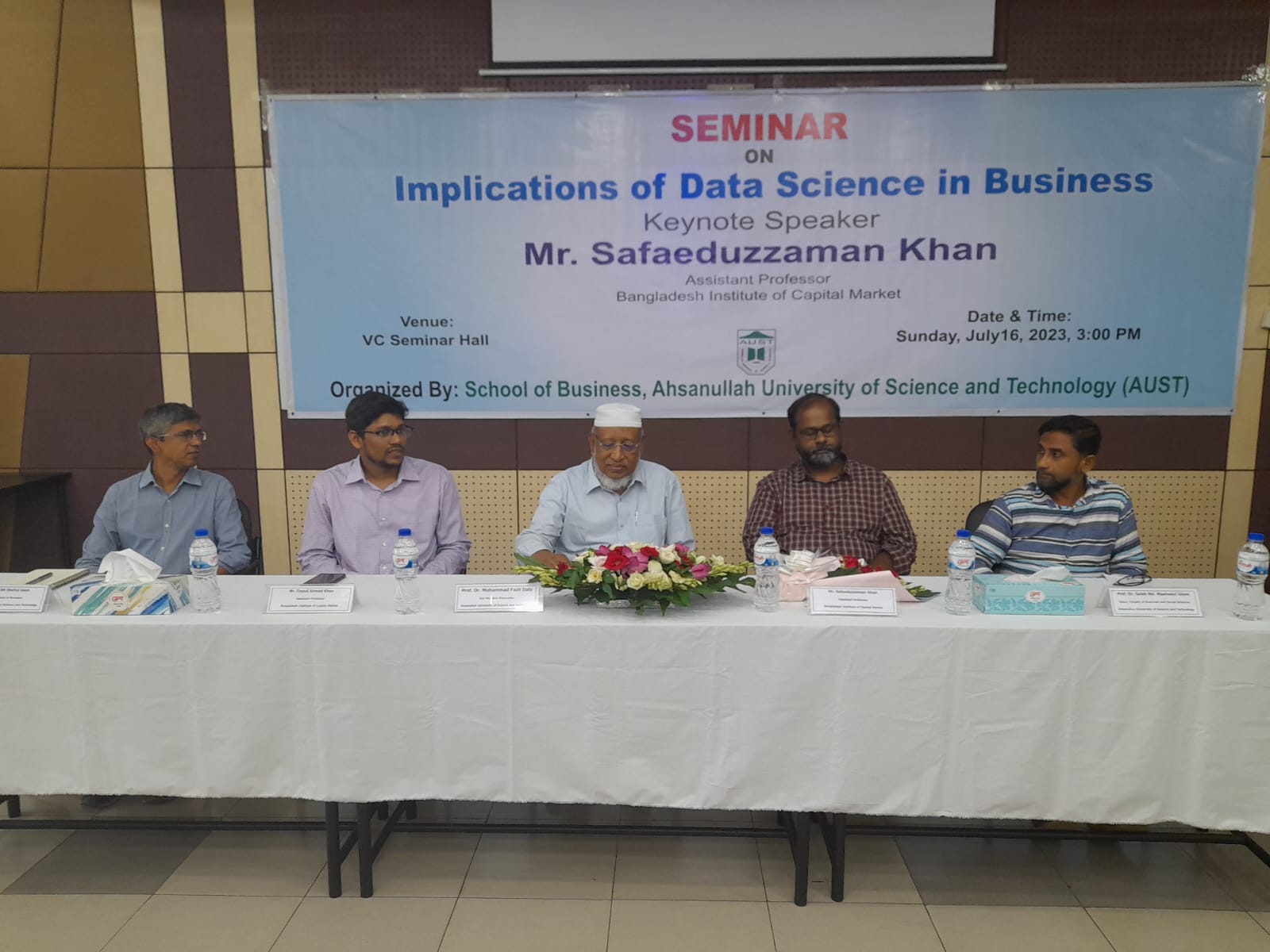 আহ্ছানউল্লা ইউনিভার্সিটি অব সায়েন্স অ্যান্ড টেকনোলজি’র (এইউএসটি) ব্যবসায় প্রশাসন বিভাগের শিক্ষার্থীদের নিয়ে Implications of Data Science in Business শীর্ষক একটি সেমিনার অনুষ্ঠিত হয়েছে। আজ রোববার (১৬ জুলাই) ঢাকার তেজগাঁও এ অবস্থিত এইউএসটি’র ভিসি সেমিনার হলে সেমিনারটি অনুষ্ঠিত হয়।