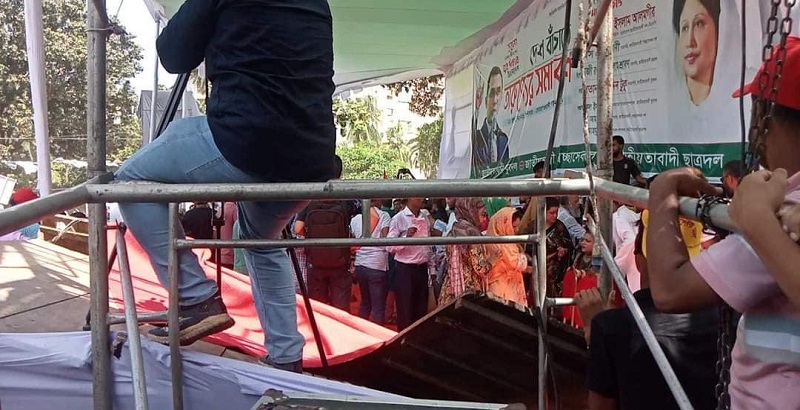 দুপুর দুইটার দিকে মাইকে নেতারা বার বার মঞ্চ থেকে নেমে যাওয়ার অনুরোধ করলেও কেউ শোনেনি। এক পর্যায়ে হঠাৎ মঞ্চটি ধসে পড়ে। পরে ছোট একটা সাদা পিকআপ ভ্যান এনে অস্থায়ী মঞ্চ করা হয়। তাতে কয়েকটি চেয়ার ও বক্তৃতার ডায়াস স্থাপন করা হয়।