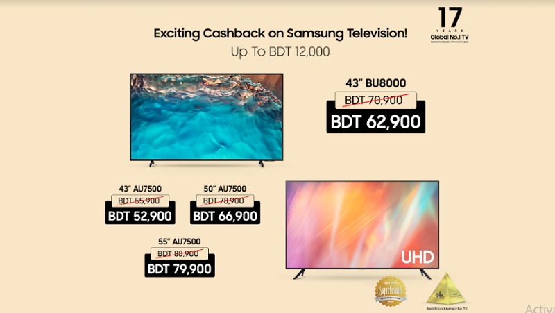 মডেলের ওপর নির্ভর করে ক্রেতারা ১২,০০০ টাকা পর্যন্ত ক্যাশব্যাক অফার উপভোগ করতে পারবেন। স্যামসাং বিইউ৮০০০ এর ৪৩ ইঞ্চি টিভির দাম এখন ৭০,৯০০ টাকার পরিবর্তে মাত্র ৬২,৯০০ টাকা। আর এইউ৭৫০০ সিরিজের টিভিগুলোর – ৪৩ ইঞ্চির দাম ৫৫,৯০০ টাকার পরিবর্তে ৫২,৯০০ টাকা, ৫০ ইঞ্চির দাম ৭৮,৯০০ টাকার পরিবর্তে ৬৬,৯০০ টাকা এবং ৫৫ ইঞ্চির দাম ৮৮,৯০০ টাকার পরিবর্তে ৭৯,৯০০ টাকা।