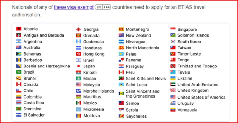 ইউরোপীয় ইউনিয়নের ভ্রমণ বিষয়ক অফিসিয়াল ওয়েবসাইটের তথ্যমতে, এখন ভিসামুক্ত প্রবেশাধিকার পাচ্ছে এমন ৬০টিরও বেশি দেশের নাগরিকদের ২০২৪ সাল থেকে ইউরোপ ভ্রমণের আগে ইউরোপীয় ভ্রমণ তথ্য ও অনুমোদন ব্যবস্থায় (ইটিআইএএস) অনুমতির জন্য আবেদন করতে হবে। এই আবেদনের জন্য খরচ হবে প্রায় আট মার্কিন ডলার।