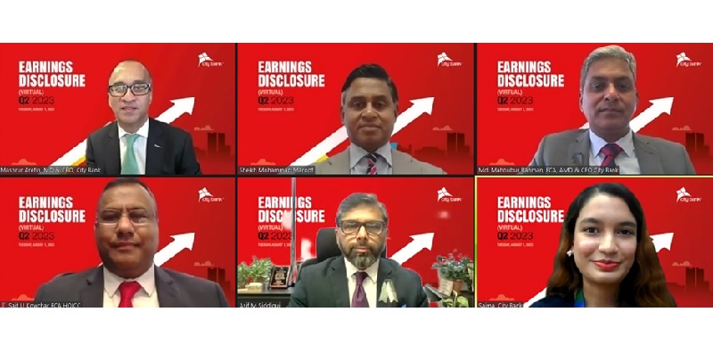 সিটি ব্যাংক তাদের ২০২৩ সালের দ্বিতীয় প্রান্তিকের আর্থিক প্রতিবেদন প্রকাশ করেছে। এ উপলক্ষে মঙ্গলবার (১ আগস্ট) ব্যাংকের প্রধান কার্যালয়ে আয়োজিত অনলাইন প্ল্যাটফর্মের মাধ্যমে বিনিয়োগকারী, শেয়ার বিশ্লেষক এবং গণমাধ্যমের কাছে ব্যাংকের আর্থিক প্রতিবেদন সম্পর্কে বিস্তারিত তথ্য জানানো হয়। অনুষ্ঠানটি বিশ্বজুড়ে ওয়েবে সরাসরি সম্প্রচার করা হয়।