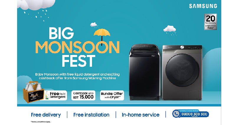 বর্ষাকাল মানেই যেন ভেজা, স্যাঁতস্যাঁতে, কাদা-পানিতে নোংরা হয়ে যাওয়া কাপড়চোপড়। আর এই বর্ষা ঋতুতে কাপড় ধোয়া নিয়ে সকল সমস্যার সমাধান করতে ‘বিগ মনসুন ফেস্ট’ ক্যাম্পেইন নিয়ে এলো স্যামসাং। ক্রেতাদের জন্য থাকছে স্পেশাল লন্ড্রী গিফট বক্স, ১৫,০০০ টাকা পর্যন্ত তাৎক্ষণিক ক্যাশব্যাকের অফার সহ নানান আকর্ষণীয় ডিল রয়েছে।