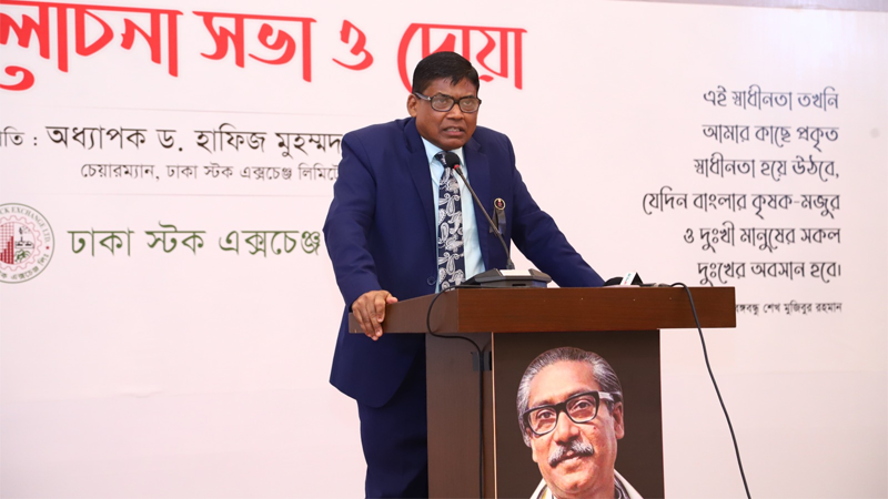 দেশের প্রধান পুঁজিবাজার ঢাকা স্টক এক্সচেঞ্জের (ডিএসই) চেয়ারম্যান অধ্যাপক ড. হাফিজ মুহম্মদ হাসান বাবু বলেছেন, আমাদের পুঁজিবাজার আমাদেরকেই দাঁড় করাতে হবে। ঢাকা স্টক এক্সচেঞ্জ পুঁজিবাজারের মূল কর্ণধার। এজন্য আমরা সকলকে সাথে নিয়ে কাজ করতে চাই। তাহলে দেশের পুঁজিবাজার এগিয়ে যাবে। বঙ্গবন্ধুর স্বপ্ন বাস্তবায়নে পুঁজিবাজারকে এগিয়ে নিতে হবে।