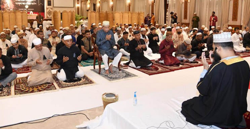 দোয়া মাহফিলে যোগদানের আগে দরবার হলে আসরের নামাজ আদায় করেন রাষ্ট্রপ্রধান। আসরের নামাজের আগে এক সংক্ষিপ্ত আলোচনা সভা হয়।