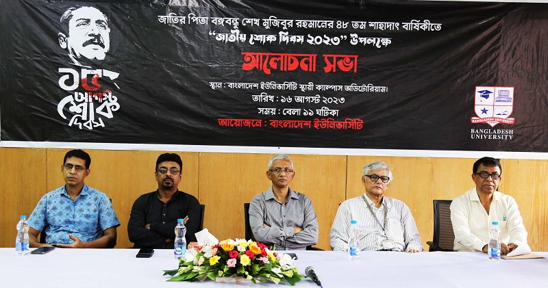 বঙ্গবন্ধু শেখ মুজিবুর রহমানের ৪৮তম শাহাদাৎ বার্ষিকী ও জাতীয় শোক দিবস উপলক্ষে আজ বুধবার (১৬ আগষ্ট) বাংলাদেশ ইউনিভার্সিটির (বিইউ) স্থায়ী ক্যাম্পাস মিলনায়তনে আলোচনাসভা অনুষ্ঠিত হয়েছে।