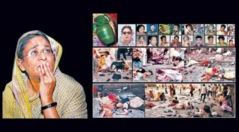 তখন ক্ষমতায় ছিল বিএনপি-জামায়াত নেতৃত্বাধীন চারদলীয় জোট সরকার। সেদিন ‘সন্ত্রাস, জঙ্গিবাদ ও দুর্নীতি বিরোধী’ শান্তি সমাবেশের আয়োজন করেছিল তৎকালীন বিরোধী দল আওয়ামী লীগ। আজকের প্রধানমন্ত্রী শেখ হাসিনা এতে প্রধান অতিথি ছিলেন। সন্ত্রাস বিরোধী শান্তি সমাবেশের আগে বঙ্গবন্ধু এভিনিউতে স্থাপিত অস্থায়ী ট্রাকমঞ্চে দাঁড়িয়ে বক্তৃতাশেষ হওয়ার পরপরই তাকে লক্ষ্য করে উপর্যুপরি গ্রেনেড হামলা শুরু হয়। বিকট শব্দে বিস্ফোরিত হতে থাকে একের পর এক গ্রেনেড। কিছু বুঝে ওঠার আগেই মুহুর্মুহু ১৩টি গ্রেনেড বিস্ফোরণের বীভৎসতায় মুহূর্তেই মানুষের রক্ত-মাংসের স্তুপে পরিণত হয় সমাবেশস্থল। বঙ্গবন্ধু এভিনিউ পরিণত হয় এক মৃত্যুপুরীতে। স্প্লিন্টারের আঘাতে মানুষের হাত-পাসহ বিভিন্ন অংশ ছিন্নভিন্ন হয়ে চারদিকে ছড়িয়ে-ছিটিয়ে পড়ে। সভামঞ্চ ট্রাকের চারপাশে ছড়িয়ে ছিটিয়ে থাকতে দেখা যায় রক্তাক্ত নিথরদেহ। লাশ আর রক্তে ভেসে যায় বঙ্গবন্ধু এভিনিউর সামনের পিচঢালা পথ। নিহত-আহতদের জুতা-স্যান্ডেল ছড়িয়ে ছিটিয়ে পড়ে।