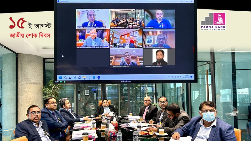 পদ্মা ব্যাংক লিমিটেড বঙ্গবন্ধু শেখ মুজিবুর রহমানের ৪৮তম শাহাদাতবার্ষিকী ও জাতীয় শোক দিবস উপলক্ষে মাসব্যাপী কর্মসূচীর অংশ হিসেবে ব্যাংকের ১০২ তম পর্ষদ সভায় আলোচনা সভা ও শোক প্রস্তাব গ্রহণ করা হয়েছে।