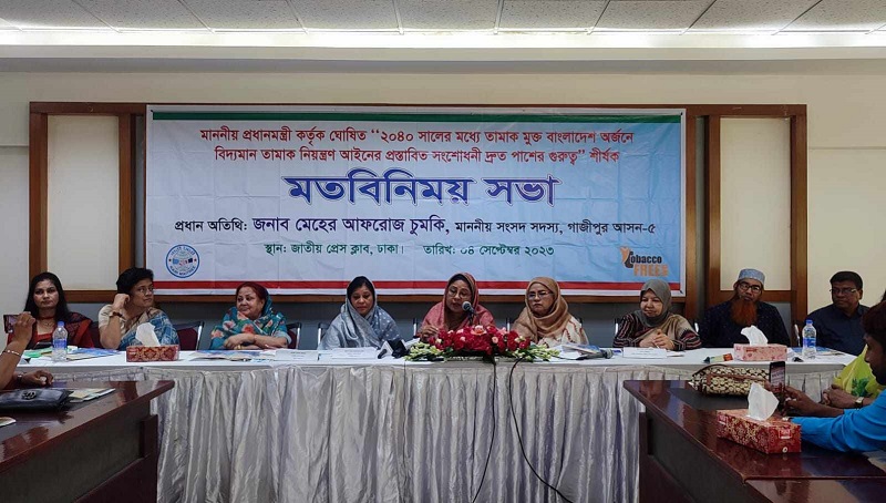মতবিনিময় সভায় তামাক বিষয়ক প্রবন্ধে নারী মৈত্রীর তামাক নিয়ন্ত্রণ প্রকল্পের সমম্বয়কারী নাসরিন আক্তার জানান, স্বাস্থ্য মন্ত্রণালয় কর্তৃক প্রণীত তামাক নিয়ন্ত্রণ আইনের সংশোধিত খসড়াতে ধুমপানের নির্ধারিত এলাকা বিলুপ্ত, বিক্রয়স্থলে তামাকজাত দ্রব্য প্রদর্শন নিষিদ্ধ, খুচরা বিড়ি-সিগারেট বিক্রি বন্ধ, ই-সিগারেট নিষিদ্ধ, তামাক কোম্পানির সিএসআর কার্যক্রম বন্ধ ও সিগারেটের প্যাকেটে সতর্কবার্তার পরিসর ৫০ থেকে ৯০ শতাংশ বাড়ানোর প্রস্তাব করা হয়েছে, যা আইনটিকে আরও শক্তিশালী করবে। ফলে তামাকের কারণে একদিকে যেমন মৃত্যুহার কমবে অন্যদিকে জনস্বাস্থ্যের উন্নয়ন ঘটবে।