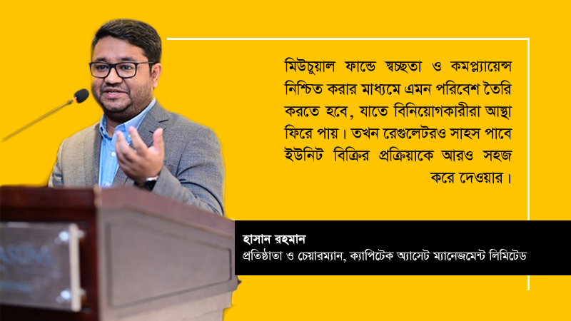 হাসান রহমান: মিউচুয়াল ফান্ড নিয়ে বিনিয়োগকারীদের মধ্যে কিছু নেতিবাচক ধারণা রয়েছে। তবে সবাইকে এক পাল্লায় মাপা ভুল হবে। ব্যাংক খাতেও বিভিন্ন ক্যাটাগরির প্রতিষ্ঠান আছে। অ্যাসেট ম্যানেজম্যান্টের সবাই যে একরকম হবে এটা ভাবার কোনো কারণ নেই। এই খাতে অনেক ভালো প্রতিষ্ঠানও রয়েছে। আমরা কমপ্ল্যায়েন্স নিশ্চিত করার চেষ্টা করি। তাই রেগুলেটর আমাদের স্বাধীনতা সুবর্ণজয়ন্তী পুরস্কার দিয়েছে। এছাড়া আমরা ধারাবাহিকভাবে ভালো লভ্যাংশ দেওয়ার চেষ্টা করেছি। এমনকি করোনা অতিমারি এবং রশিয়া-ইউক্রেন যুদ্ধের ফলে সৃষ্ট সংকটকালীন পরিস্থিতিতেও এই ধারা বজায় রয়েছে। পেশাদারিত্বের সঙ্গে সব কাজ করার চেষ্টা করছি আমরা। আমাদের ম্যানেজমেন্টের টিম দেখলেই সেটি বোঝা যায়। এসব  বিষয় বিবেচনায় নিয়ে বিনিয়োগকারীরা ফান্ডটিতে বিনিয়োগ করবেন বলে আশা করি।