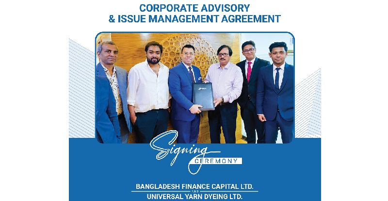 বাংলাদেশ ফাইন্যান্স ক্যাপিটাল লিমিটেড এবং পোশাক খাতের প্রতিষ্ঠান ইউনিভার্সাল ইয়ার্ন ডাইং লিমিটেডের মধ্যে একটি কর্পোরেট চুক্তি স্বাক্ষর অনুষ্ঠিত হয়েছে। চুক্তি অনুযায়ী, বাংলাদেশ ফাইন্যান্স ক্যাপিটাল; ইউনিভার্সাল ইয়ার্ন ডাইং’র কর্পোরেট উপদেষ্টা হিসেবে কাজ করবে। পাশাপাশি প্রতিষ্ঠানটির এসএমই বোর্ডের আইপিও ইস্যু ম্যানেজার হিসেবে কাজ করবে।