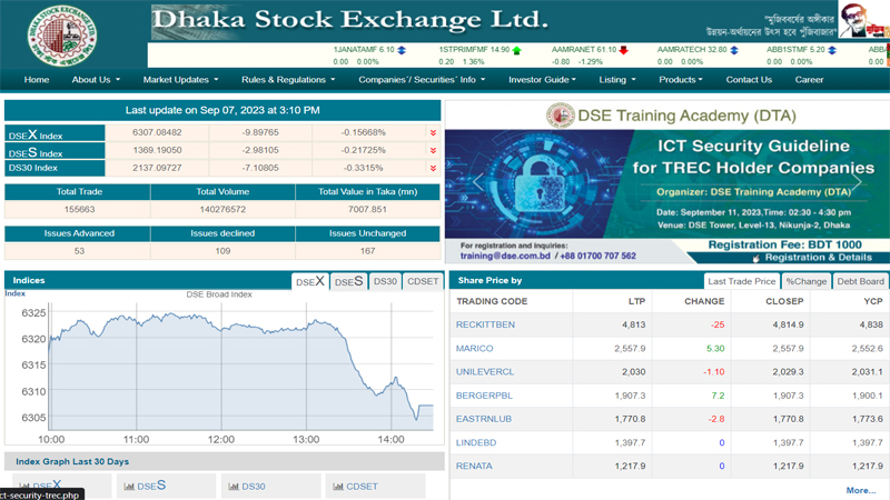 সূত্র মতে, বৃহস্পতিবার (৭ সেপ্টেম্বর) লেনদেন শেষে ঢাকা স্টক এক্সচেঞ্জের প্রধান সূচক ‘ডিএসই এক্স’ ৯ দশমিক ৮৯ পয়েন্ট কমেছে। সূচকটি আজ লেনদেন শেষে ৬ হাজার ৩০৭ পয়েন্টে দাড়িয়েছে।