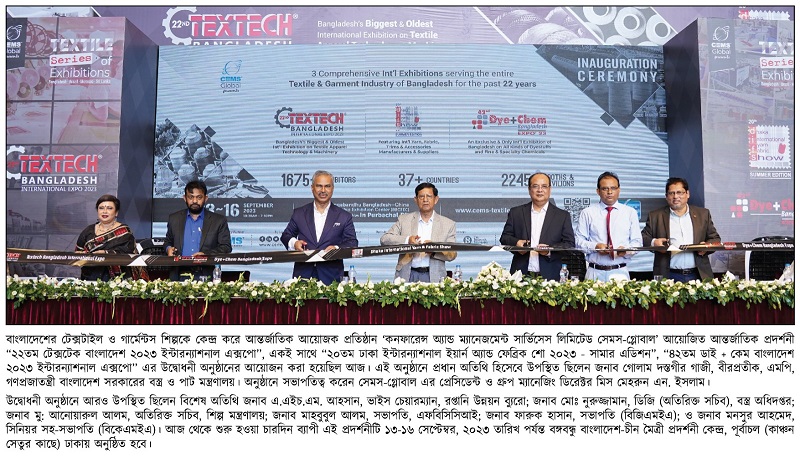 টেক্সটাইল, গার্মেন্টস প্রযুক্তি ও মেশিনারি কেন্দ্রিক “২২তম টেক্সটেক বাংলাদেশ ২০২৩ ইন্টারন্যাশনাল এক্সপো” এর প্রদর্শনীতে বাংলাদেশের সমগ্র বস্ত্র ও গার্মেন্টস শিল্প আবারও একত্রিত হচ্ছে কনফারেন্স অ্যান্ড এক্সিবিশন ম্যানেজমেন্ট সার্ভিসেস- সেমস-গ্লোবাল ইউএসএ আয়োজিত টেক্সটাইল সিরিজ অফ এক্সিবিশনের বাংলাদেশ সংস্করণে। আজ থেকে ১৬ই সেপ্টেম্বর ৪দিন ব্যাপী পূর্বাচলের বঙ্গবন্ধু বাংলাদেশ-চীন মৈত্রী প্রদর্শনী কেন্দ্র (বিবিসিএফইসি)-এ অনুষ্ঠিত হবে এক্সপো।